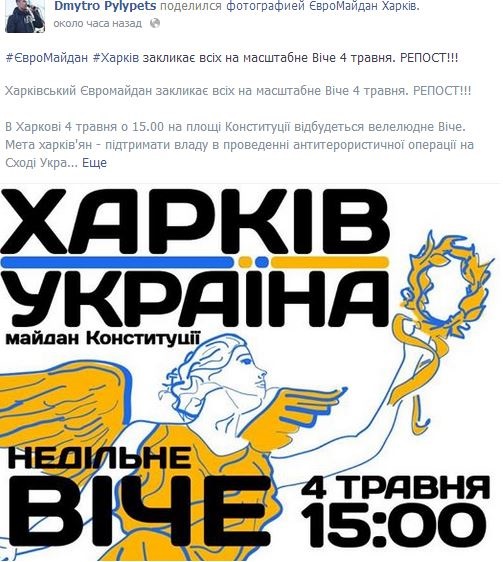"В Харькове 4 мая в 15.00 на площади Конституции состоится многолюдное Вече. Цель харьковчан - поддержать власть в проведении антитеррористической операции на Востоке Украины и продемонстрировать всему миру, что Харьковщина за единство Украины", - написал Пилипец.